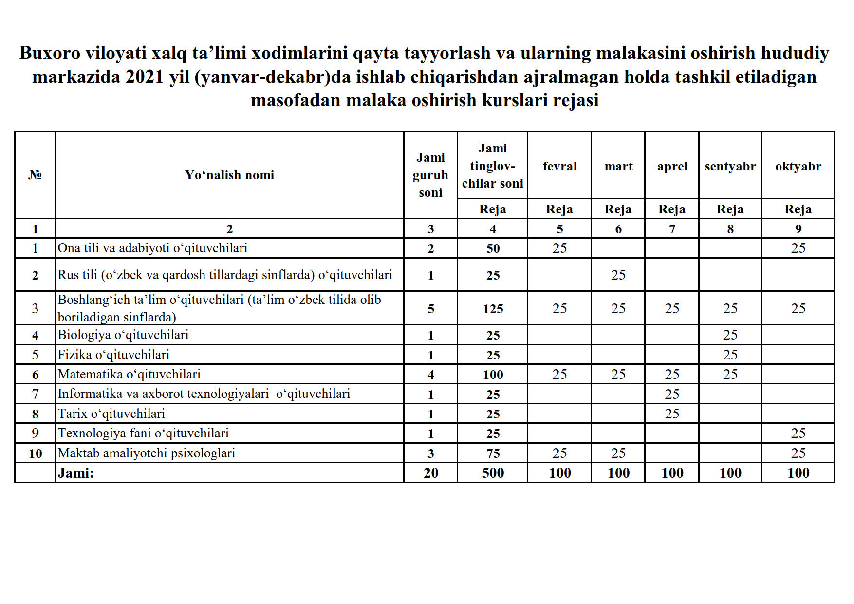 Buxoro viloyati XTXQTMOHM dagi 2021 yil tumanlar kesimida masofaviy malaka oshirish kurslari rejasi