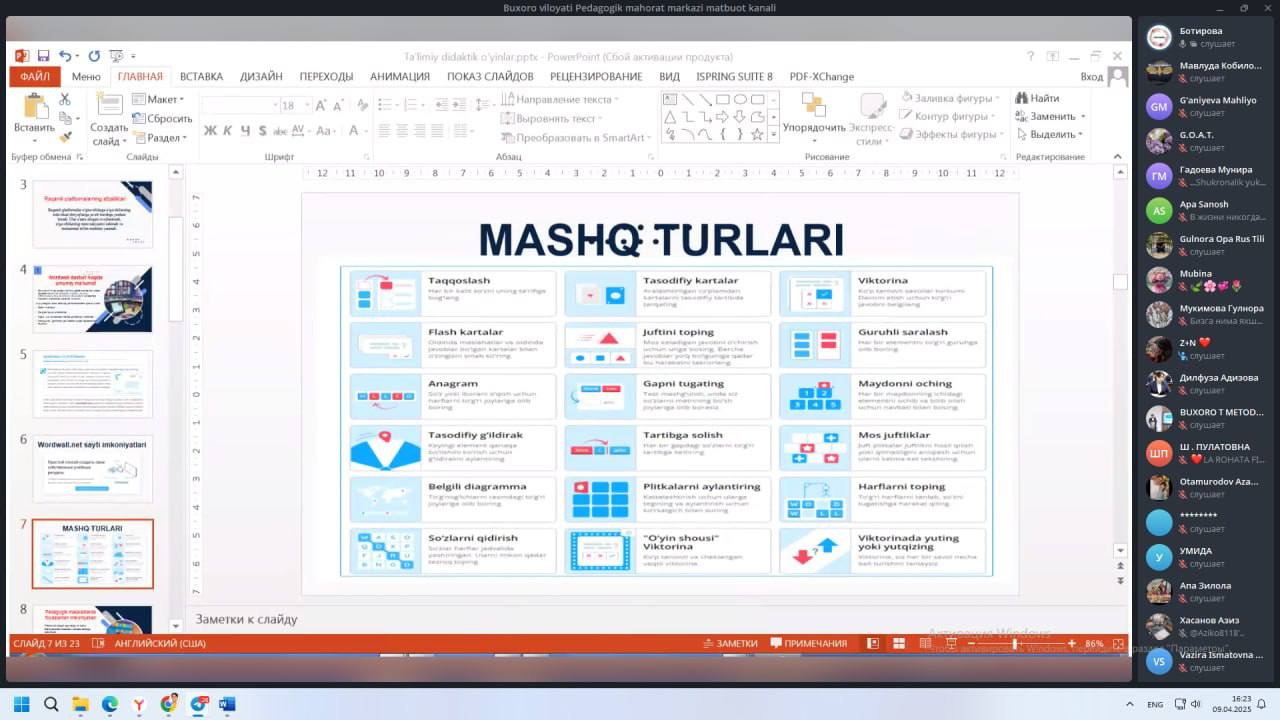 Unda "Wordwall" onlayn ta’limiy platformasi imkoniyatlari, turli xil didaktik o‘yinlar, testlar, viktorinalar, moslashtirish mashqlari va boshqa interaktiv kontentlar yaratish o'rgatildi.